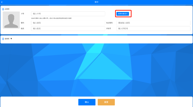 第一步,點擊領(lǐng)卡然后點擊下圖紅框選定的選擇未激活卡按鈕